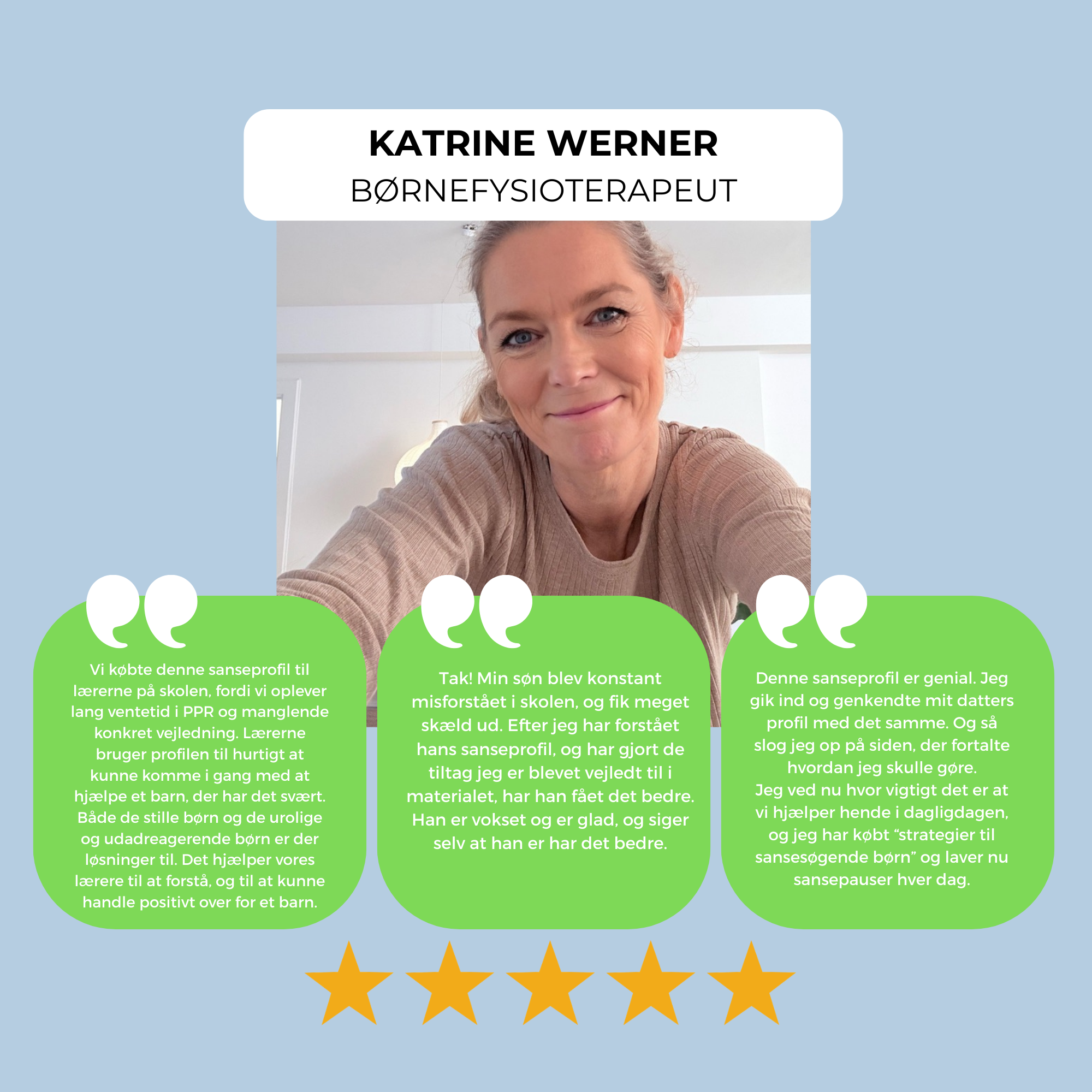 Jeg anbefaler denne sanseprofil til forældre, pædagoger, skolelærere, børnefysioterapeuter og ergoterapeuter og alle der arbejder med børn i dagligdagen.