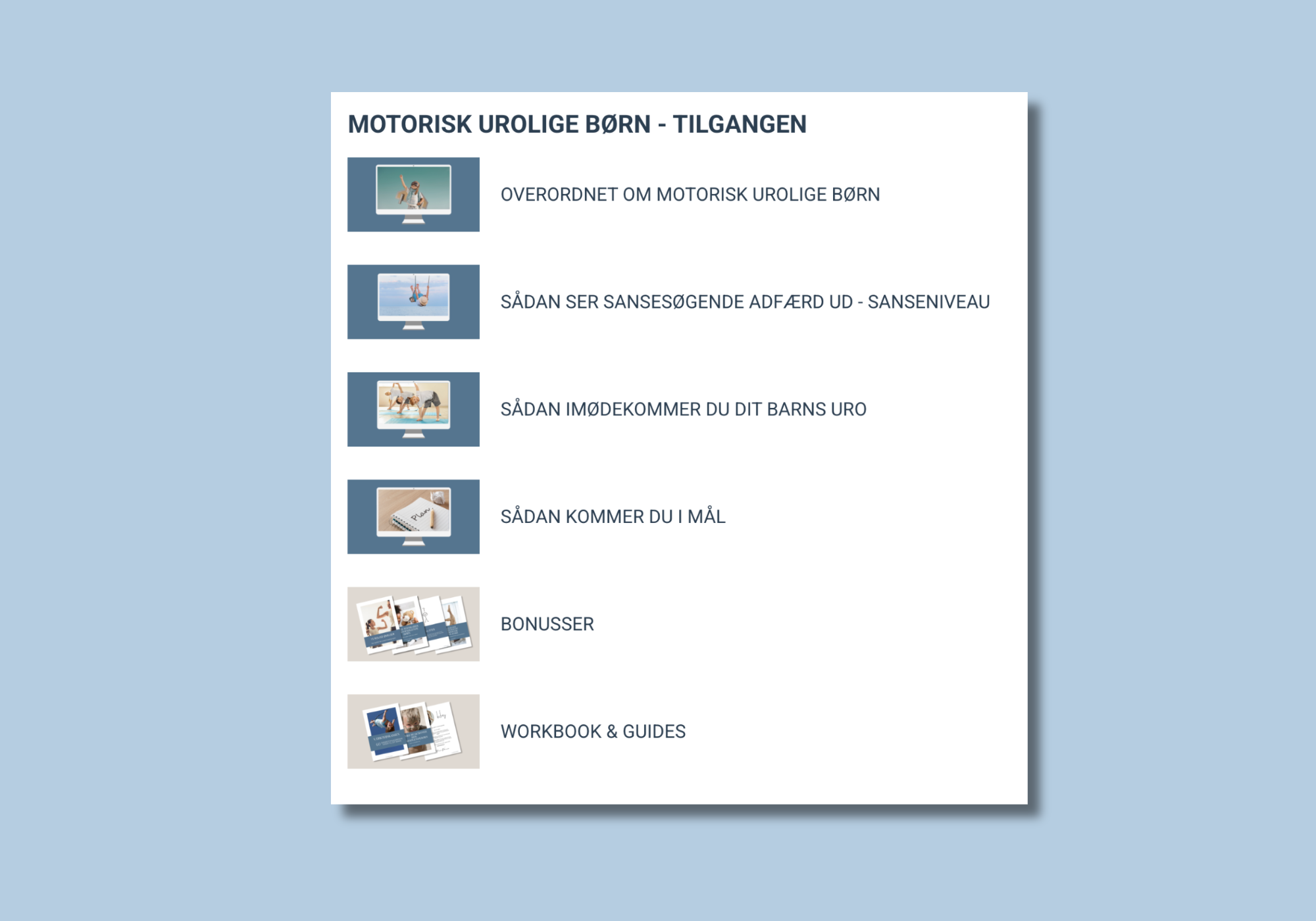 Du får blandt andet to e-bøger om sanseapparatet, så du hele tiden kan gå tilbage og blive specifik på dit barns sanser og handlemuligheder.